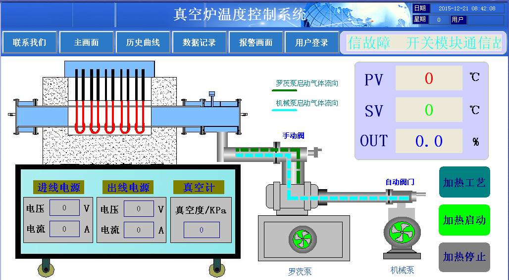 采用MCGS 10寸触摸屏,使用Modbus协议通过RS485与真空计、KY温控器、开关量模块、电量模块形成通信网络,实时监控真空炉状态。人机界面包括:真空炉操作主界面、报警记录、温度历史曲线、真空度历史曲线、数据记录。