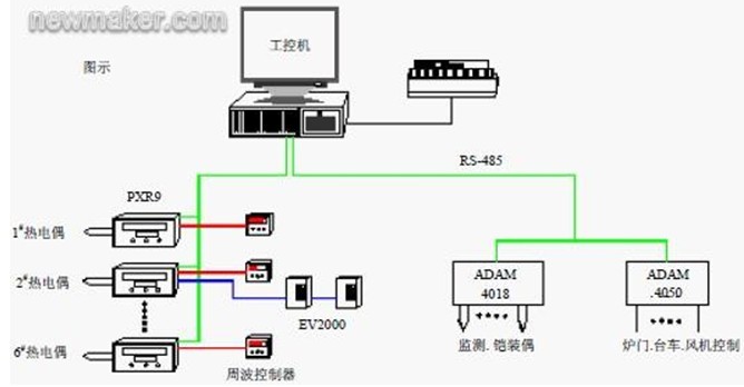 控制系统由工控机 IPC-610H、研华PCI-1612B、ADAM4018、ADAM4050、辉达程序控制模块组成集散控制系统,采用RS-485 通信。上位机主要完成工艺曲线的设定、过程曲线和数据的记录、工艺过程监视。温度控制则由温控仪通过周波控制器和变频器完成。当上位机出现故障时,下级控制单元可继续完成热处理工艺而不影响生产及产品质量。