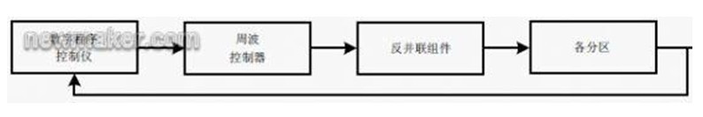 这部分属单回路控制系统。以退火炉为例,每炉分为6 个区,各区包括一支控温偶、一支监测偶、加热元件(加热管)、一台循环风机,每台炉有两台冷却风机。被控量即为每个区的控制热电偶检测到的温度。辉达程序控制模块根据当前设定值与实际值经PID 运算后输出4~20mA 信号给周波控制器和变频器,分别控制反并联晶闸管组件和冷却风机,从而形成闭环控制。系统框图如图2 所示。