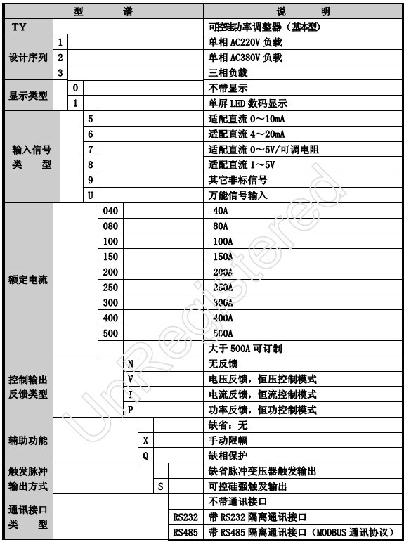 三相可控硅功率调整器TY-3000系列TY-316110RS485三相晶闸管功率调整器适用于各种阻性负载和感性负载,主要用于各种电加热装置的加热功率调整,既可以手动调整,又可以和电动调节仪表、智能调节仪表、PLC及计算机控制系统配合。
