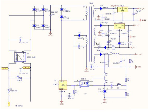 市电经过桥式整流,变为直流电压,再通过高频开关管TOP223快速的转换成交流输出,最后经过开关变压器T1输出直流电给负载端,这样可以再一次有效的滤除市电所带来的干扰。