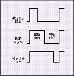 比例控制设计用于消除伴随通断控制的循环。比例控制器在温度接近设定值时降低供给加热器的平均功率。这能够减慢加热器加热,以便温度不会超过设定值,但会接近设定值并维持在一个稳定的温度。这种比例作用可通过以短时间间隔接通和切断输出来实现。这种“时间比例控制”通过“打开”时间和“关闭”时间的比率变化来控制温度。