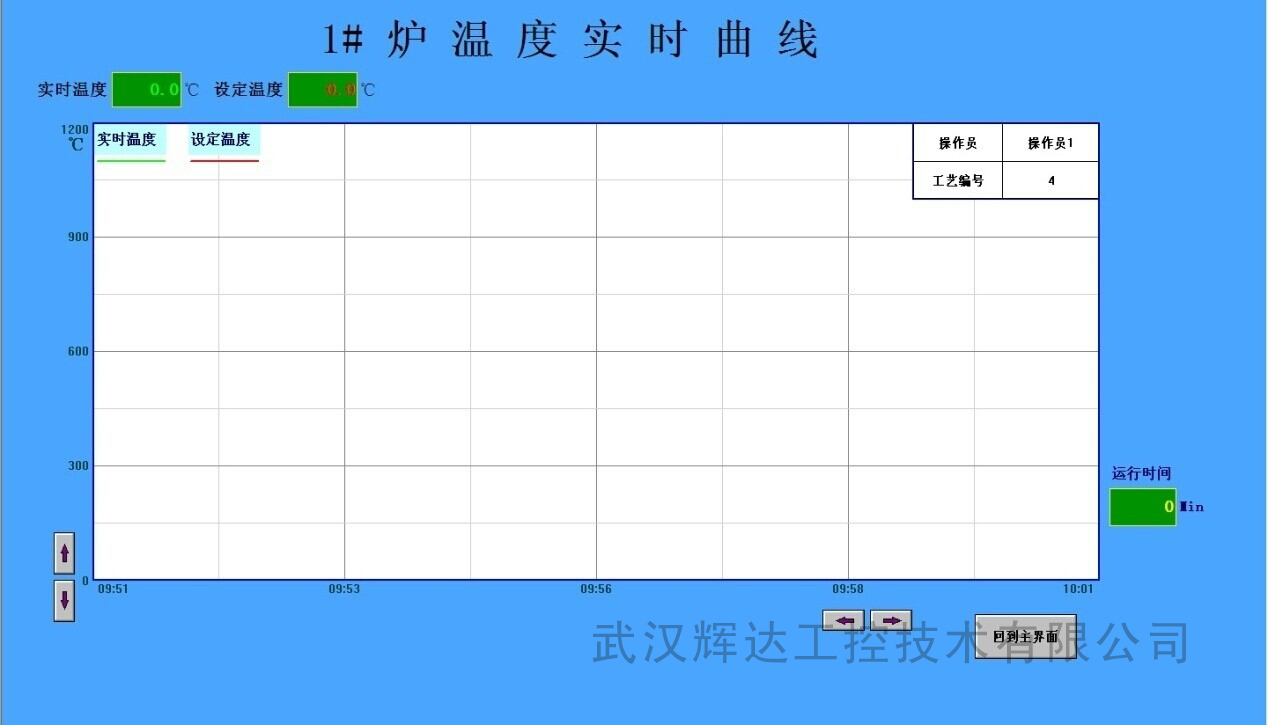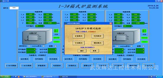 为方便操作和管理,整个热处理控制系统采用全电脑集散控制监控,所有功能模块均带有MODBUS通讯接口,能方便地与计算机联机工作,考虑到简单、方便、适用的原则,计算机显示组态主要由“温度控制系统总貌”、“实时曲线”、“历史报表”、 “历史曲线”、“参数设定”、“报警记录”等多个画面单元组成。计算机开机后点击桌面的组态运行系统,即可进入“xx系统”。