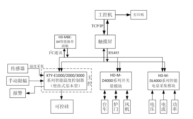 采用HD-M-D4000系列开关量模块和HD-M-DL4000系列智能电量采集模块,分别对风机、炉门的升降、台车的进出、电流、电压等进行控制和监测。