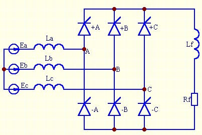 为了便于分析,我们将三相桥式SCR可控硅整流电路简化为图(1)所示的等效电路,其中,Ea、Eb、Ec为阳极相电势,La、Lb、Lc分别为阳极回路各相等效电感,Lf、Rf为整流桥直流侧负载,对于同步发电机励磁系统来说,即为发电机转子回路等效电感、电阻。