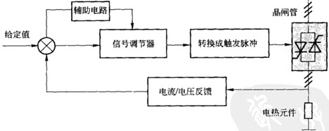 晶闸管交流调压器分为三相晶闸管交流调压器和单相晶闸管交流调压器两种,两者的工作原理基本相同。图二是一个典型的闭环交流调压器原理框图,由信号调节器、脉冲触发器、晶闸管、电压或电流反馈环节以及辅助电路构成。如果采用移相触发,当由于某种原因使调压器输出电压降低时,输人给信号调节器的控制偏差增大,信号调节器输出增大,转换成的触发脉冲,使得截止角减小,导致调压器输出电压增大,最终达到稳定调压器的输出电压。