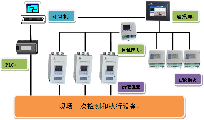 按系统设计要求,辊道窑炉控制柜设计总功率约为200KW,共分26个温区,其中24个温区采用一体化可控硅控温单元进行温度控制。采用我公司的KY系列一体化智能可控硅移相触发模块组合,带RS485通讯功能,作为基本功率调节单元,分别对每控温区进行温度控制,可满足0-1300℃温度范围内0.5%的控温精度。