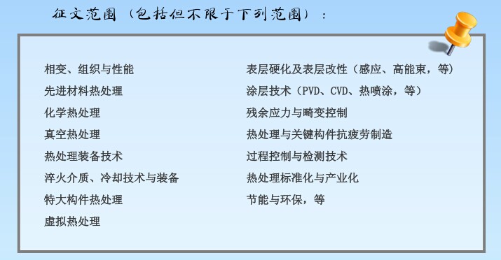 第十一次全国热处理大会现面向国内外征文,热忱欢迎从事热处理及相关专业的专家学者、科研人员、高校师生和企业界人士踊跃投稿!欢迎行业同仁广泛参与!征文范围(包括但不限于下列范围):