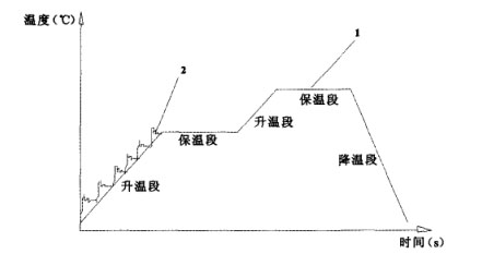 温度控制主要有定时定温和比例料温两种控制方式。其中定时定温是工业生产中最常用的控温方式。即在规定的时间内使温度升高到设定的温度,要求实现线性升温。如图2所示,曲线1为设定理想退火工艺曲线。曲线2为细分曲线示意图。要想使实际退火曲线逼近设定曲线,就需要采用细分技术,图2中为了分析方便将升温段细分为五段,每小段均为轻微振荡曲线。如果将其细分为几千甚至上万段,则可以无限逼近设定曲线,这样就实现了线性升温。具体实现方法如下:将图2中的升温段作为一个程序步,根据当前程序步的设定温度和设定时间,可以得出细分增量,细分增量=设定温度(℃)/设定时间(S)。即每秒增加一个细分增量,则模块中的给定温度=上次给定温度+细分增量。如此循环下去,直到程序步结束。