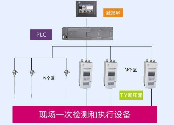 采用触摸屏作为人机操作界面,采用PLC控制若干区调压器,并辅助几个扩展模块共同实现设备的温度、压力和相关动作控制,通过触摸屏监控设备完成数据的记录和存储。