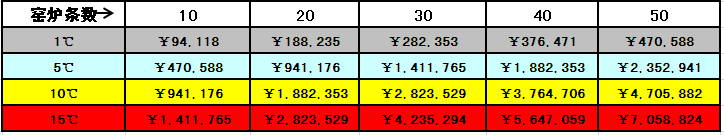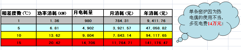 由于炉材蓄热,窑炉表面散热及气体带出的热量未记入,热电偶误差造成的消耗是远大于上表所述数值的;贵公司如果窑炉数量在10条以上,热电偶有两年没有更换的话,因此造成的电费消耗每年至少在100万以上;