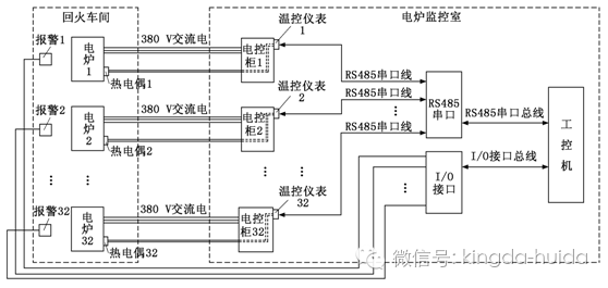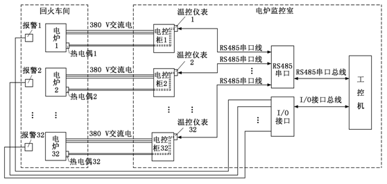 本文介绍了一种热处理车间回火炉集散控制系统方案,实现了回火炉温度控制柜的集中安装、控制及管理。该热处理车间回火炉集散控制系统的总体设计采用工控机+智能温度控制器设计方案,主要由上位机、报警模块、智能温度控制通讯模块和外围接口模块组成。设计方案如图1所示。