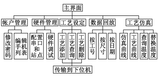 炉集散控制系统监控系统软件框架图如下,软件设计包括账户管理、硬件管理、工艺设定、数据回放和工艺仿真。