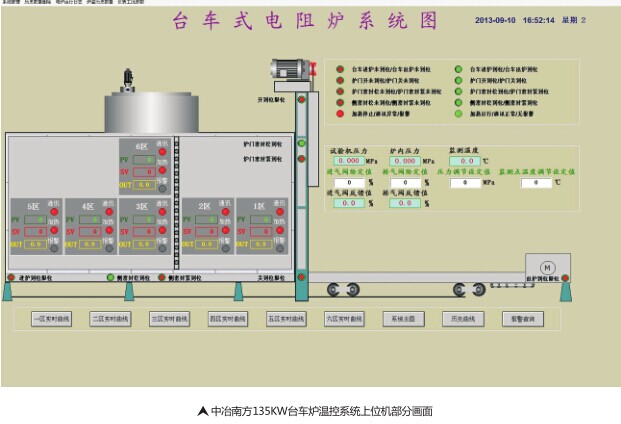 此项目电气控制按台车炉系统设计要求,控制柜设计电加热总功率为135KW,分6区,利用可控硅调压方式进行温度控制。每组采用三相加热,整体同步控制。采用智能高精度温度调节器(XMA5511F)作为主控仪表,配合三相可控硅组合模块和NZK-3M三相智能触发模块作为基本功率调节单元,对台车炉各区进行温度控制,可满足0-900℃温度范围内0.5%的控温精度。设置控制柜共5台,分别是综合控制柜1台(含炉喉区温控)、后区温度控制柜3台(三区),前区温度控制柜1台(二区共用)。其中综合控制柜完成整个系统公共参数测试,使用上位机对温度压力和电流电压数据进行显示,以及采用西门子PLC对炉门升降、台车进出、炉门压紧气缸和侧密封气缸的控制等。